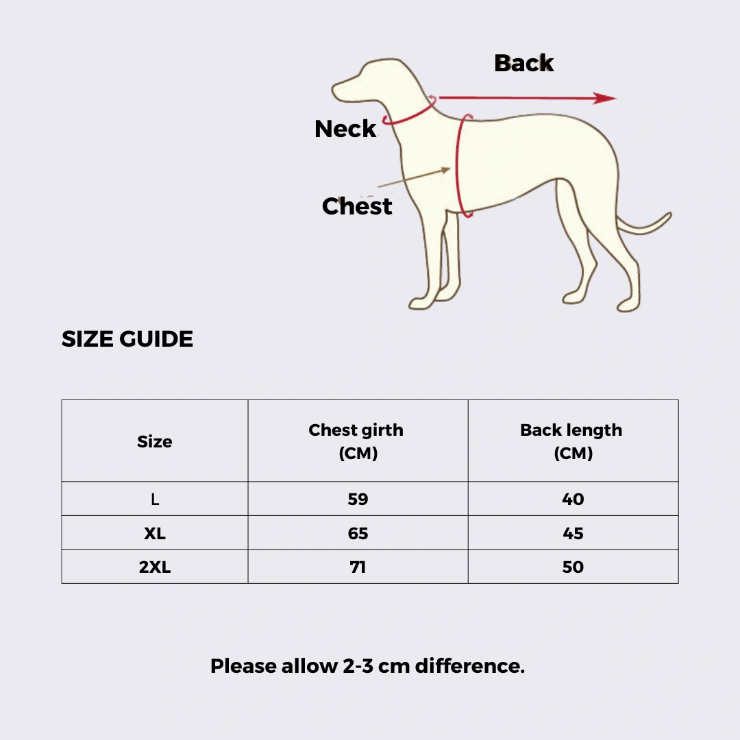 Please check your dog’s measurements against the size guide to ensure the correct fit. If your dog’s measurements fall between two sizes, we recommend choosing the larger size.